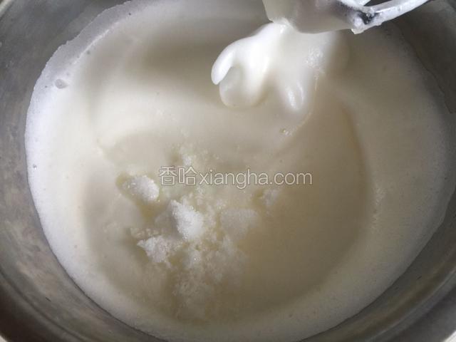 5.加入20克白糖中速搅打一分钟至湿性发泡状态。