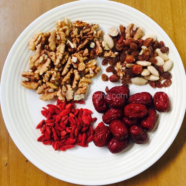 2.红枣去核,所有材料混一块,倒入250ml牛奶(我忘拍这一步了)