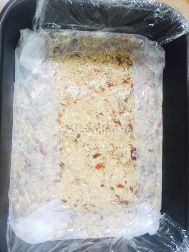 5.先用橡皮刮刀刮均,然后我铺了层保鲜膜用手压紧实,这样烤出来不平整。