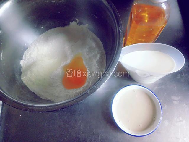 2.除了油外,把酵母和部分牛奶放入面粉中搅拌均匀,因为面粉湿度不一样,所以不要一下把牛奶加进去,把面粉搅拌成絮状