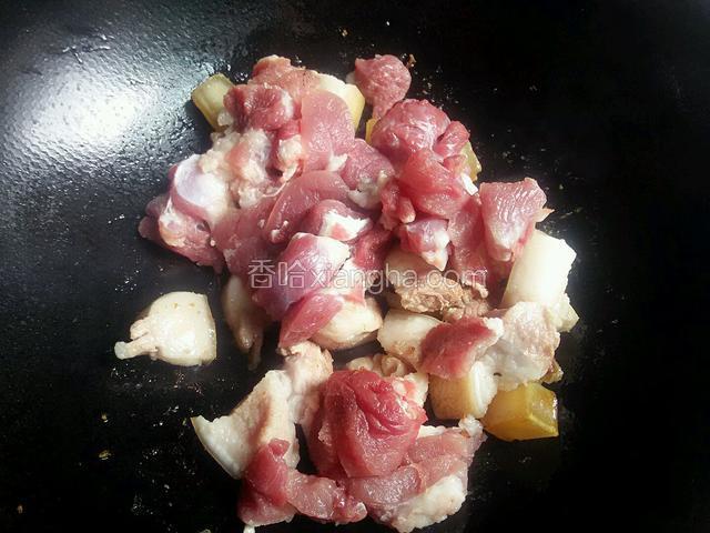 2.起锅先将带皮的放油,在将瘦肉一起煸炒至发白,放姜蒜花椒,烹白酒去腥增香。