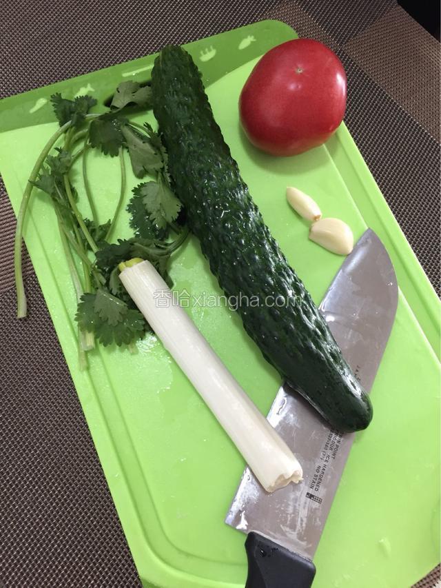 6.将黄瓜切丝 葱蒜切末 香菜切段 西红柿切片备用