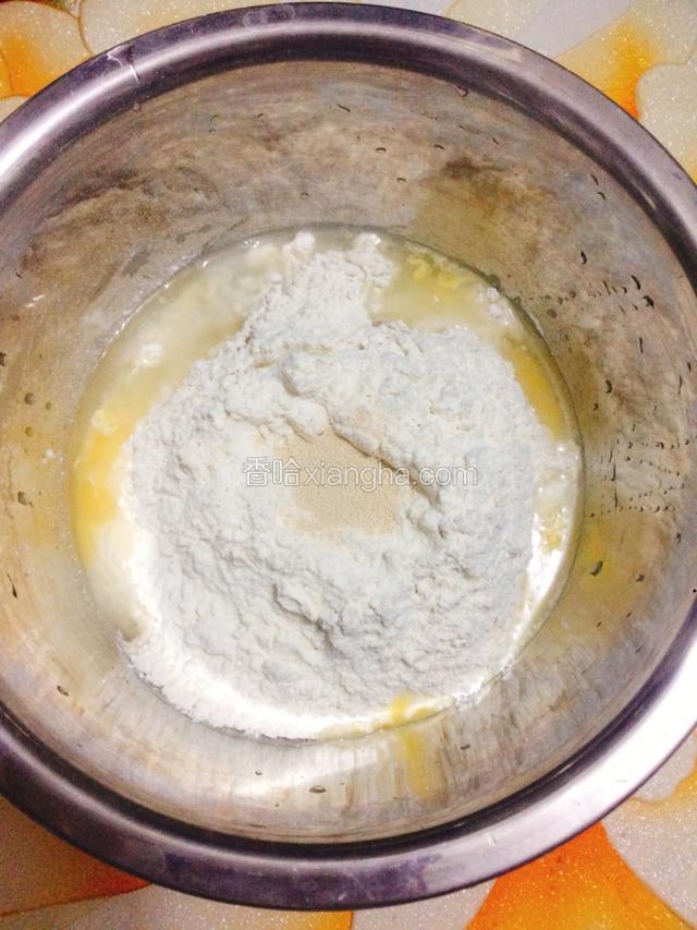 3.把除黄油和芝麻外,其它的材料全部倒入容器中,混合成面团。