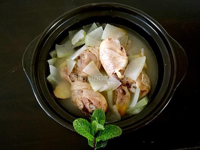 5.把鸡腿汤放到砂锅里,再把冬瓜也放进去一同煮,冬瓜煮软就可以吃了。