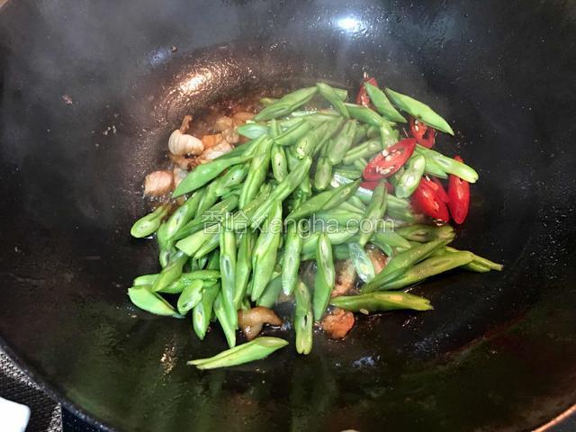 5.倒入准备好的四季豆、辣椒,翻炒均匀