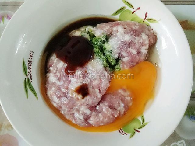 3.猪肉馅加入葱姜末、一个鸡蛋、生抽、蚝油、盐、糖,顺着一个方向搅拌均匀,备用