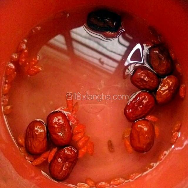 1.红枣和枸杞倒入容器再倒入少许水浸泡十分钟左右,水里加点盐