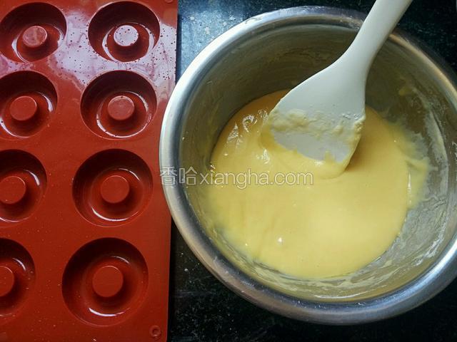 6.取一裱花带把面糊挤到模具里,不要太多,烤的时候会膨胀的,模具的7分满即可。