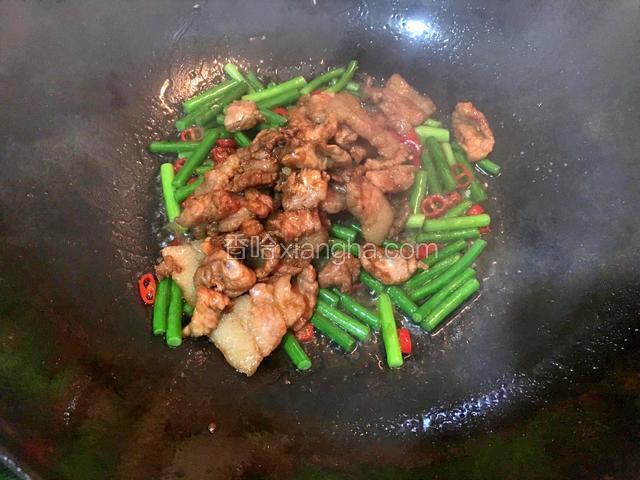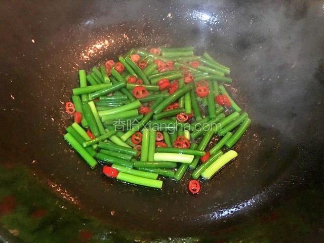 4.锅底留油,下蒜苗和辣椒翻炒均匀