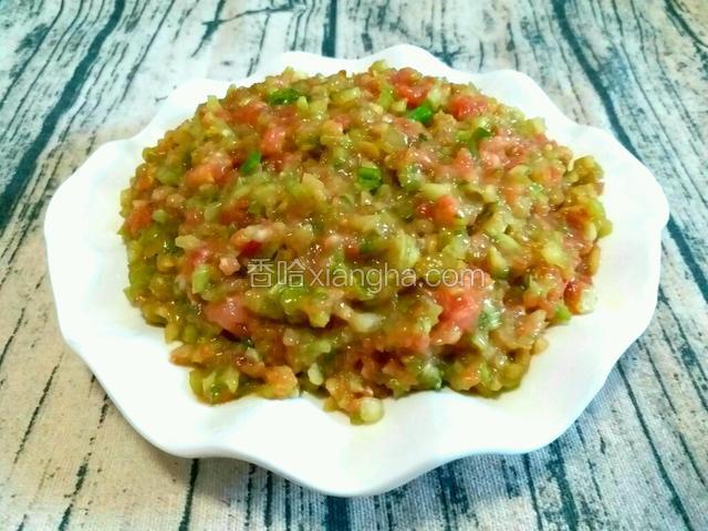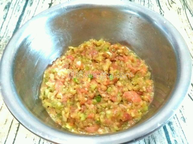 4.将猪肉馅放入盛芹菜丁的盆中。