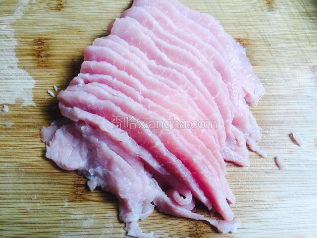 6.里脊肉切成薄片,越薄越好,否则卷土豆的时候粘不上。