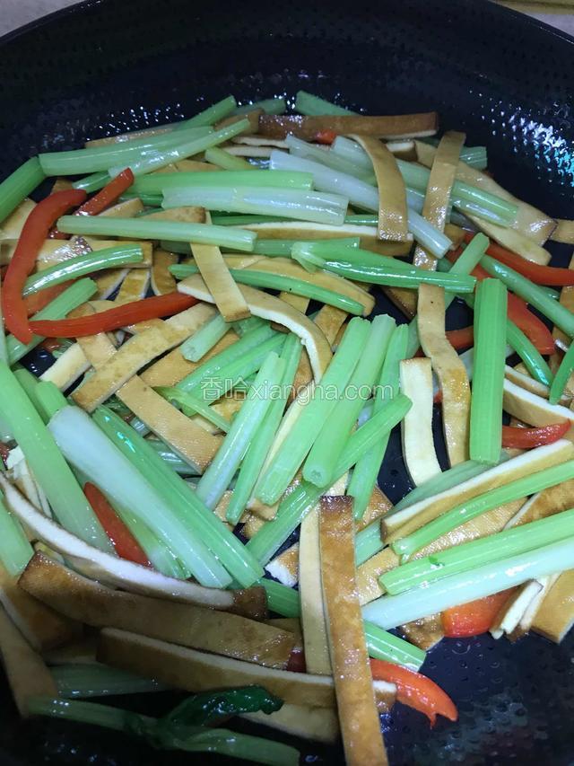 5.放入芹菜和红椒丝