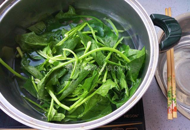9.接下来制作饺子皮 先做绿色的 用菠菜是颜色最好的 当然也可以用其他绿色蔬菜 只是效果不及菠菜是肯定的 把洗净的菠菜放入开水中焯一分钟