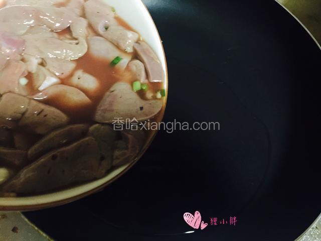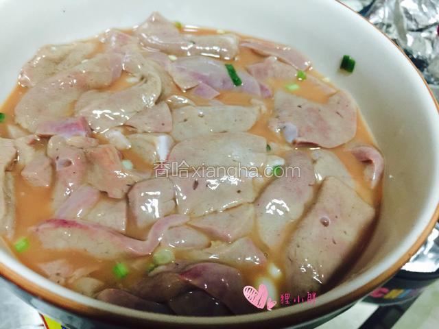 6.浸泡过的猪肝再用水冲洗后,加入淀粉,盐,白胡椒,料酒,生抽,白糖以及葱姜腌制入味儿