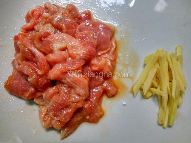 2.瘦肉切片、用生粉、酱油、油、盐、腌制10分钟、姜去皮清洗切粗丝