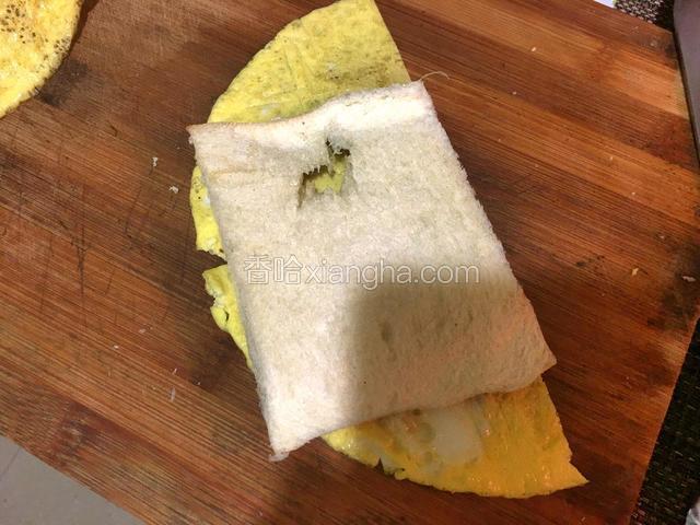4.摊好的鸡蛋饼对半切开,放上一片吐司,吐司片两端用擀面杖擀平