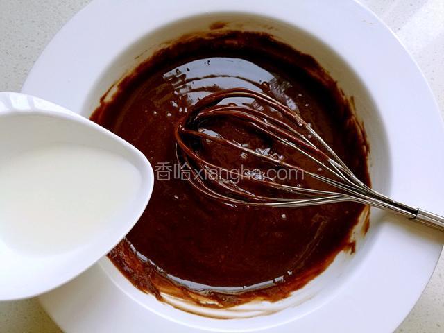 4.搅拌至黄油和巧克力完全融化,成为黄油巧克力混合液。