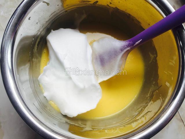 12.取三分之一的蛋白到蛋黄糊中,用由下向上的翻拌手法翻拌均匀,速度要快,防止蛋白消泡。