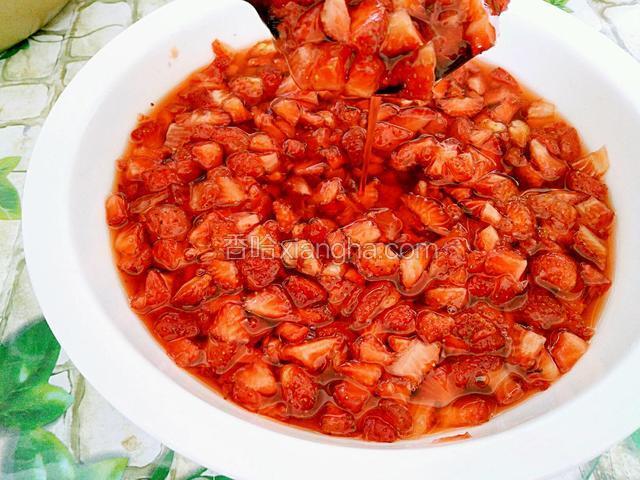 2.将草莓去蒂,然后切成小块再切成小粒备用。。
