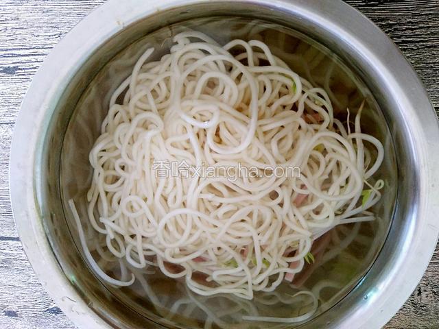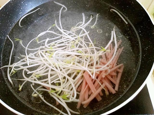 5.水开之后放入绿豆芽子和火腿肠焯熟捞起