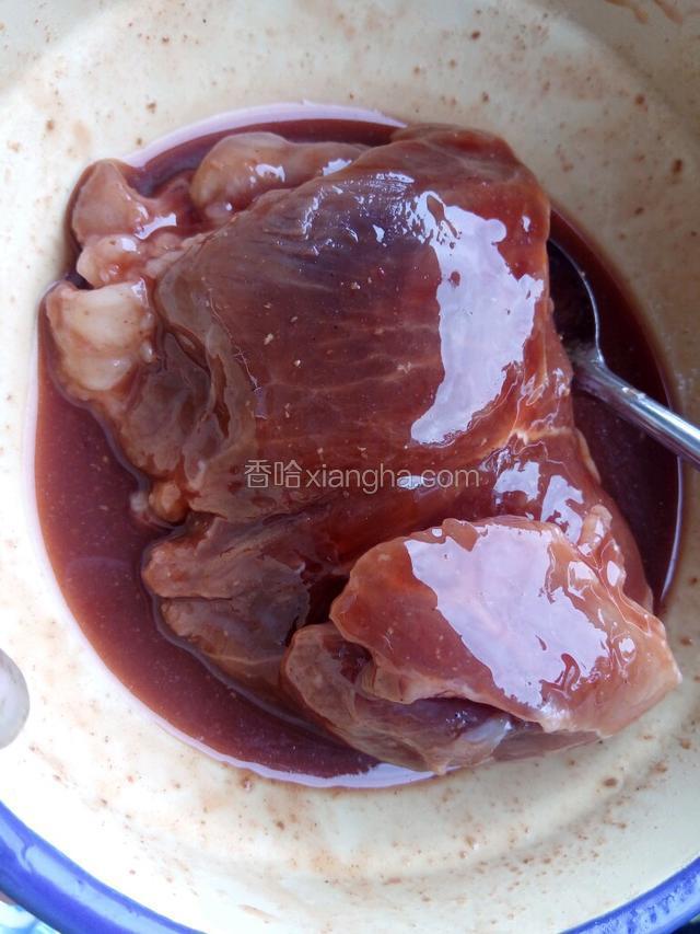 3.预热烤箱,将瘦猪肉放入烤箱烤制180度烤制20分钟,正反面同样步骤(叉烧制作方法本人香哈菜谱也有)