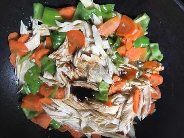 6.倒入胡萝卜跟青椒翻炒1分钟