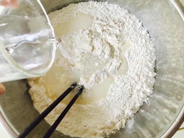 3.把热水缓缓地倒入面粉中,边倒边搅拌。