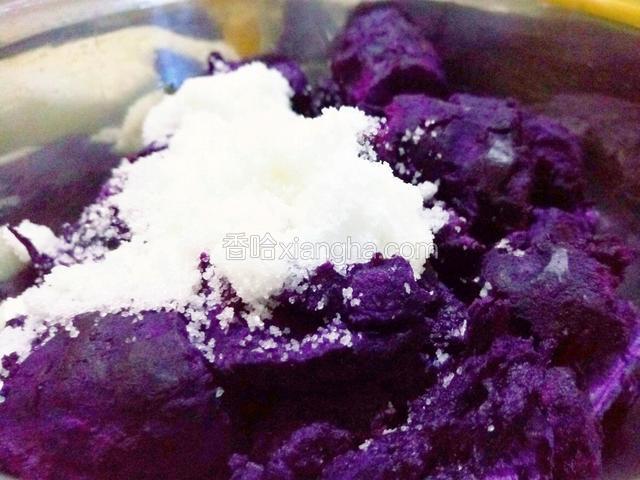 2.把紫薯肉都剥好 放入干净的盆里 放入少许糖 因为是要做馅料 所以要放糖提味 紫薯本身的甜度还是不够