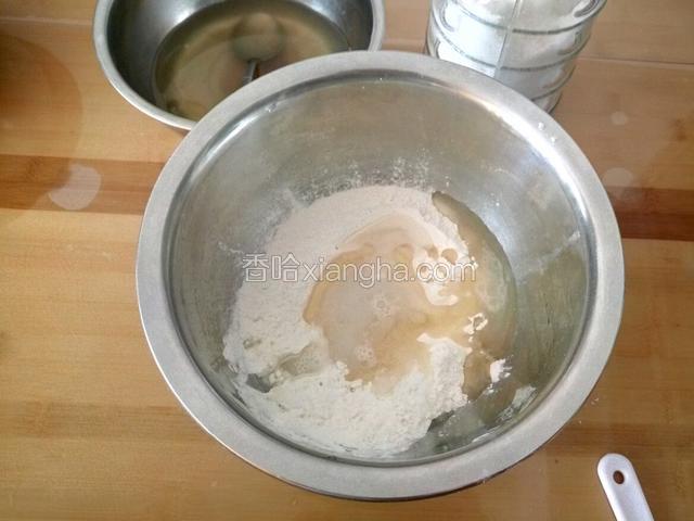 3.再用另一个干净的盆 里面放入玉米油 面粉 糖和水 揉成光滑的面团 这是水油皮