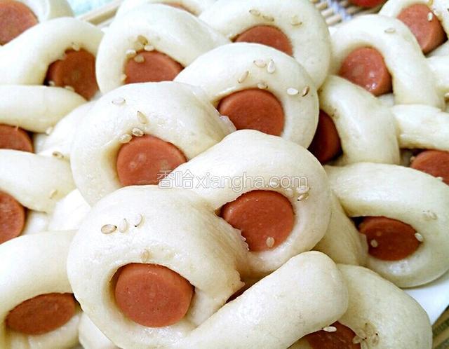 6.取一块面擀成椭圆形面片把火腿肠放入