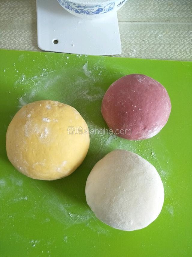 3.三种颜色面团放温暖处发酵至原来2倍大即可
