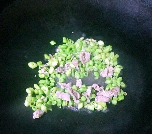 6.炒两三分钟后,倒入瘦肉翻炒五分钟左右