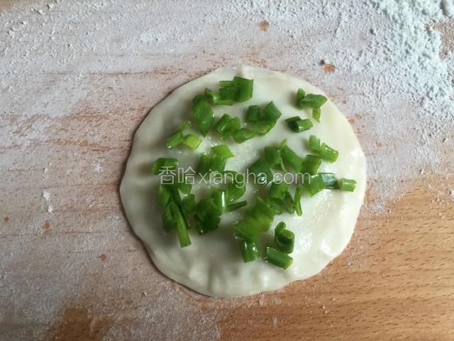 2.取一饺皮平放,刷上油再撒上少许的盐和葱花。