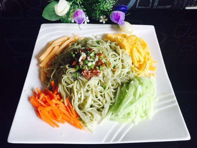 4.芝麻酱两勺,生抽两勺,耗油一勺,香油少量加蒜蓉,搅拌均匀。(如果觉得太干,可以加少量白开水)