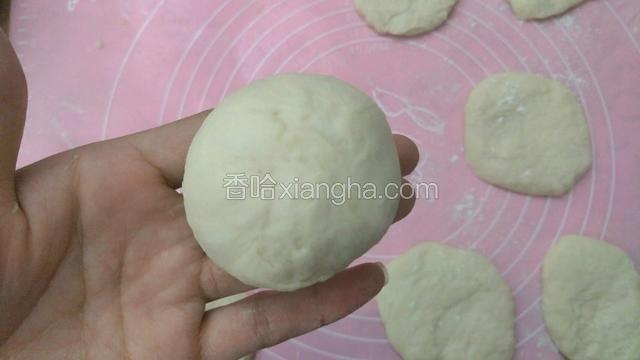 6.松弛后把小面团压扁摊平,把豆沙放在中间位置