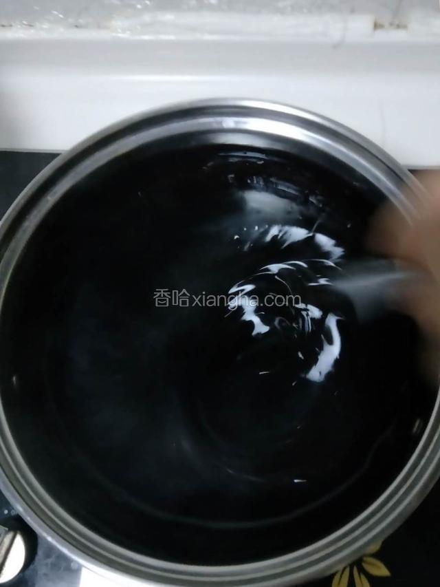 5.锅里水开后把黑凉粉糊倒入到锅里用蛋抽搅拌均匀至煮开即可(煮的过程一定要记得搅拌不然会煮糊的哦)