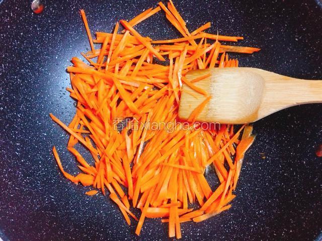 4.锅里再下少许油,把胡萝卜丝倒进去翻炒至半熟,加入适量盐翻炒均匀。