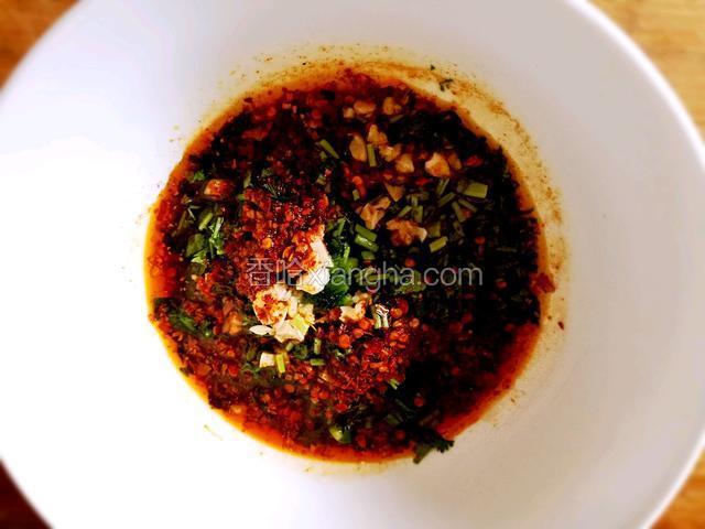 6.锅里烧热油,待油温开始冒烟时将油浇在料碗里,搅拌均匀备用