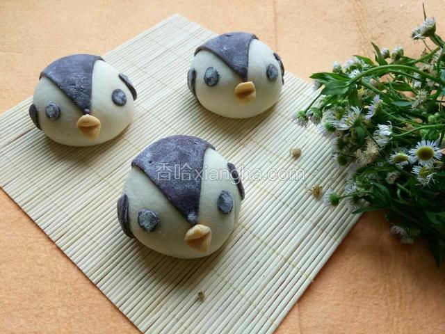 6.用黑色的面擀成面片,做成企鹅的眼睛、翅膀等,用黄色的面做成企鹅的嘴