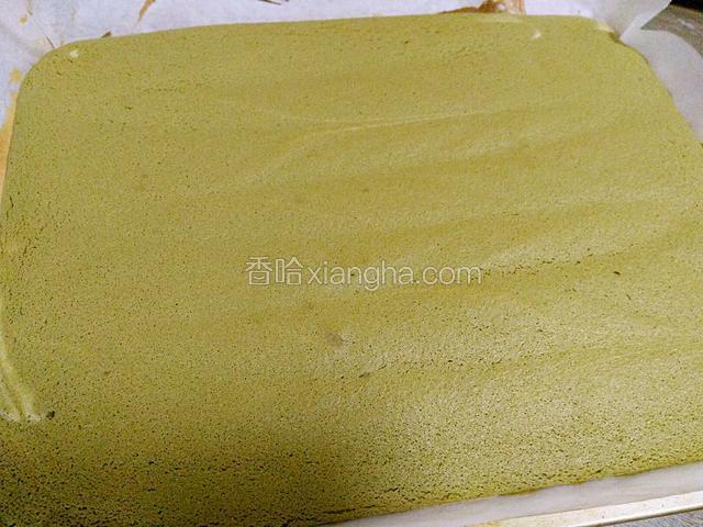 17.其余的蛋黄糊全部倒入提前铺好吸油纸的烤盘中,刮刀刮平,轻轻振几下放一边