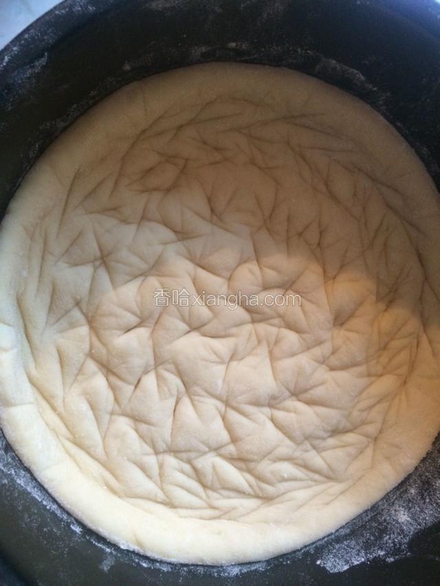 3.这时,面饼已经发酵好了,用擀面杖擀好,放在披萨盘里,用叉子或者打蛋器印花,使面饼透气。在面饼周围折起来,并涂上薄薄的蛋黄液,这样烤出来金黄色,好看又好吃。