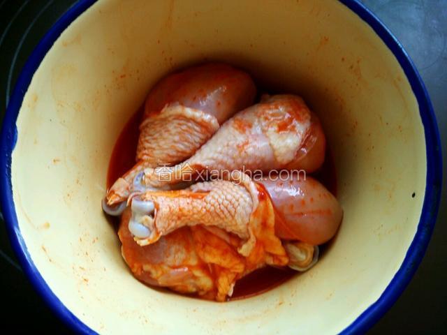 3.将鸡腿放入腌料中做按摩,然后放入冰箱冷藏过夜,中途再给鸡腿按摩几次。