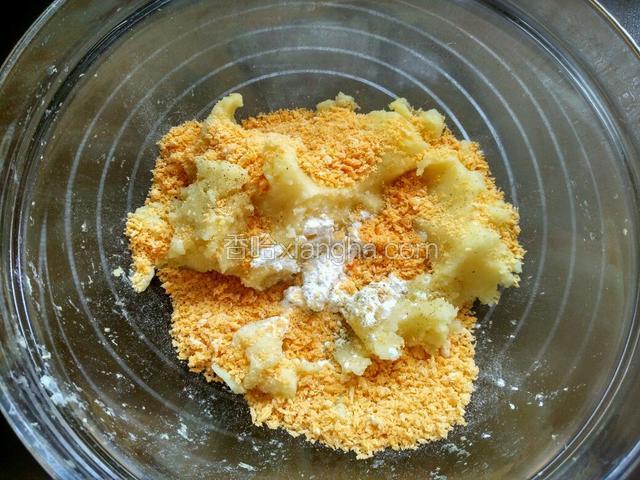 4.土豆泥中放入1勺糯米粉,适量盐和少许胡椒粉,再撒入适量面包糠。