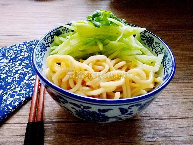 4.过凉水,加入生抽,醋,辣油,黄瓜丝