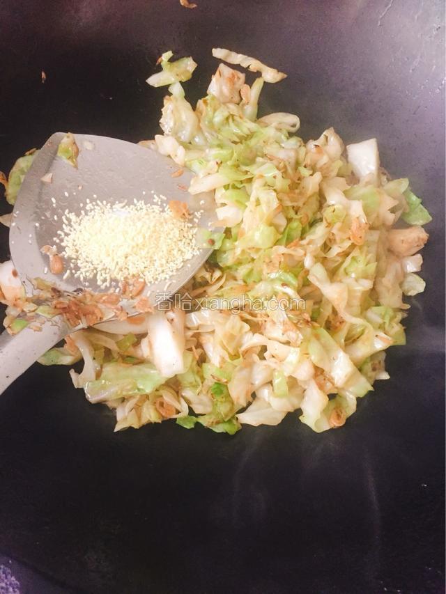 3.再倒虾皮翻炒均匀,加料酒翻炒均匀至包菜断生