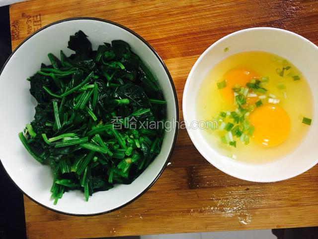 2.菠菜洗净后焯水后过下凉水再切成小段、碗中打入鸡蛋放入葱花备用。