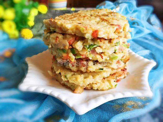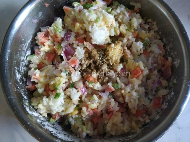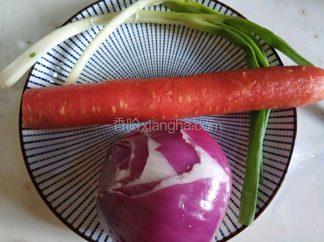 4.胡萝卜,洋葱切丁,小葱切粒放剩米饭中。