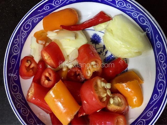 5.将大蒜籽用刀拍一下,辣椒切好备用