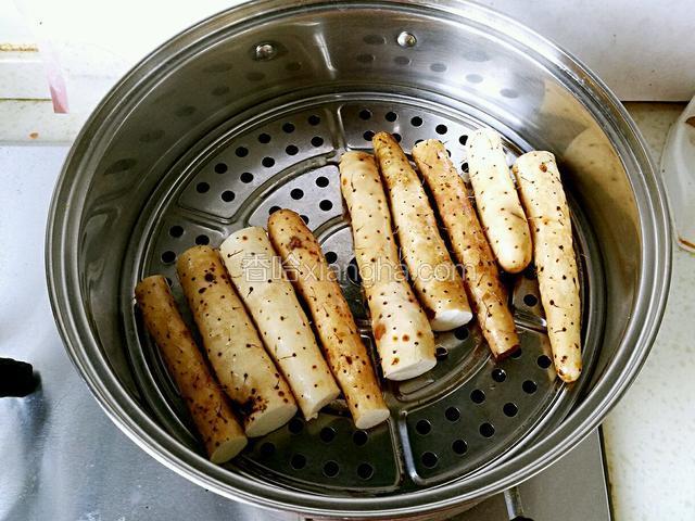 5.保鲜膜铺到浅盘中,放入一半山药泥,用勺子压平,尽量压的一样厚