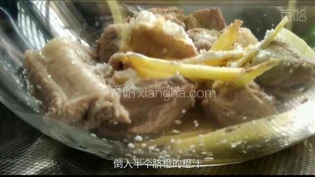 6.排骨中加入少许料酒盐,生粉和生姜丝,半个橙子的汁,抓匀后,腌制3小时。